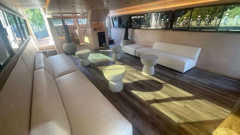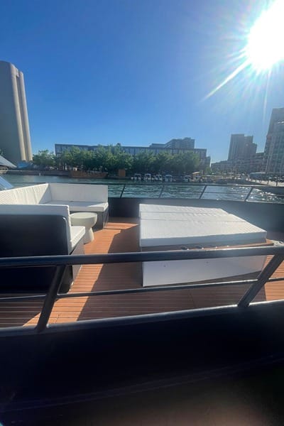 Entertain your guests in style on our luxury yacht, featuring a DJ booth, smoking area, sun deck, and high-end surround sound system. The elegant interior, with modern tones and hand-finished furniture, provides a relaxing ambiance for all.